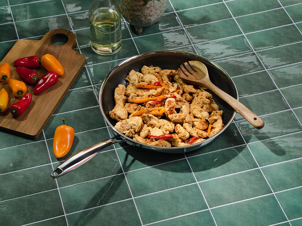 What really sets our products apart from your regular pots and pans, is the unique laser etching process that creates the patented ONYX COOKWARE™ hexagon design. This unique process creates a series of peaks and valleys on the pots and pans. In the valley is the non-stick material, making sure you get that non-stick functionality and easy cleanup. One of the peaks you get is the stainless steel, providing durability, perfect sear on your meat and the ability to use metal utensils and tools. This is why we call our pots and pans “hybrid”. They provide you with the best of two worlds; The non-stick functionality that we all want in our pots and pans and the durability of a professional stainless steel or cast iron pan.