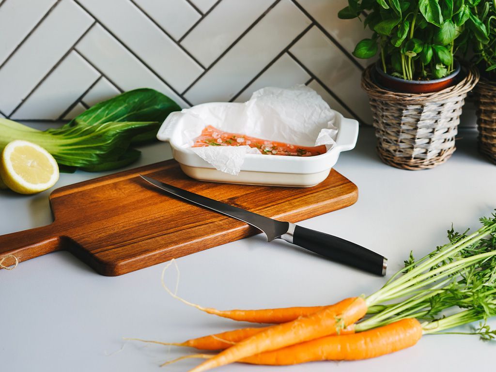 The FILLET KNIFE’s extremely thin and flexible blade enables the knife to move smoothly along the backbone of the fish and easily remove and cut through the fish's skin and bones – just like butter! Paired with the ergonomically designed handle which aids precision and maneuverability to ensure a firm grip and full control.